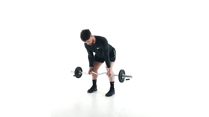 Bend forwards at the knees and hips, so the back is straight and row the bar towards your chest, bringing the elbows up and back.