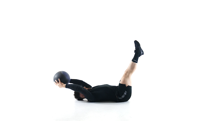 Begin on your back with legs together straight up above hips holding the medicine ball with two hands at your chest.