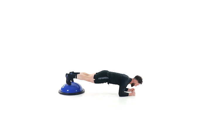 With the feet close together on top of the Balance Dome Trainer, place the elbows on the ground underneath the shoulders with the hands in fists.